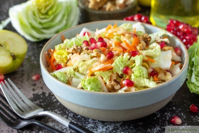 капуста пекинская, морковь, яблоки, гранат, орех грецкий, масло грецкого ореха, соль поваренная пищевая