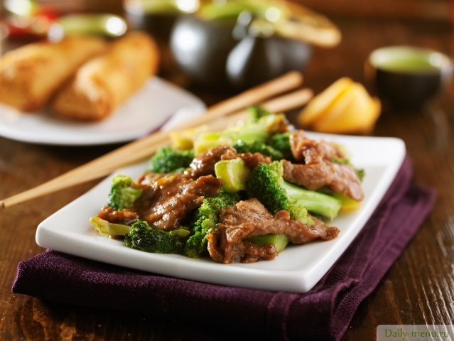 говядина вырезка, брокколи, соевый соус, масло оливковое, сахар-песок, масло кунжутное, чеснок, крахмал кукурузный