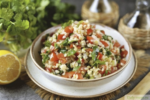 вода, помидоры, булгур, лук репчатый, масло оливковое, сок лимонный, кинза, петрушка, соль поваренная пищевая, смесь перцев