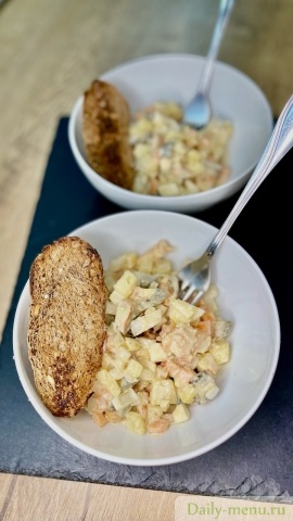 картофель вареный, йогурт 1,5% , креветки очищенные, морковь, огурец грунтовый, лук репчатый, яйцо куриное, соевый соус, сок лимонный, чеснок, соль поваренная пищевая, лавровый лист