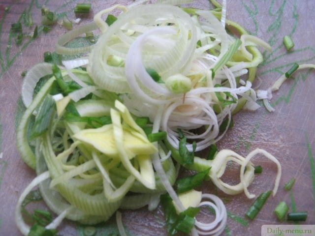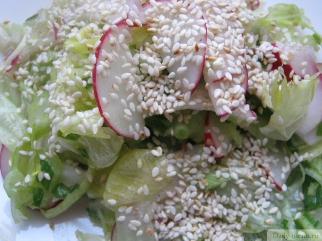 салат, редис, лук зеленый, лук-порей, сельдерей черешковый, масло оливковое, кунжут-семя, соль поваренная пищевая