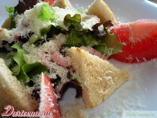 салат, креветки очищенные, помидоры, сыр пармезан, батон нарезной, чеснок, бальзамический уксус