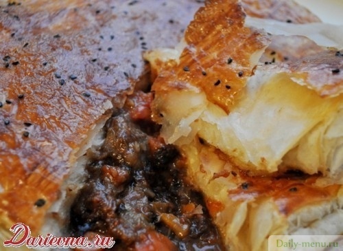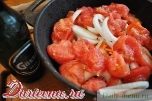 помидоры, говядина вырезка, пиво, слоеное тесто бездрожжевое, лук репчатый, морковь, яйцо куриное, мука пшеничная , тмин, соль поваренная пищевая, перец черный молотый