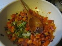 яйцо куриное, перец красный сладкий, помидоры, лук репчатый, пастрома из курицы, укроп и другие пряные травы, масло подсолнечное, соль поваренная пищевая, перец черный молотый