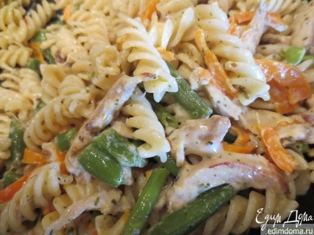 курица филе, без кожи, сливки 9% жирности, макароны из муки 1 сорта, перец сладкий, фасоль стручковая, масло подсолнечное, сыр полутвердый (голландский), соль поваренная пищевая, петрушка, перец черный молотый