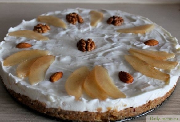 Торт без выпечки с творожно-йогуртовым кремом и грушей