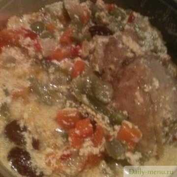 куриный окорочок, овощная смесь mexico от hortex, сливки, 10,0% жирности, лук репчатый, масло оливковое, чеснок