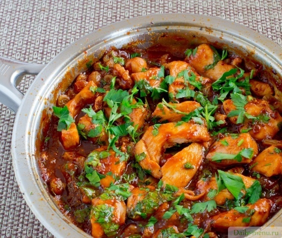 куриная грудка, без кожи, томаты консервированные целые, лук зеленый, томатная паста, чеснок, масло оливковое, базилик сушеный