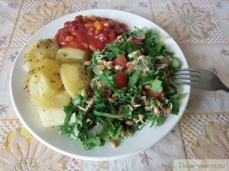 огурец грунтовый, помидоры, салат, редис, шпинат, лук зеленый, масло подсолнечное, кунжут-семя, кресс-салат, укроп и другие пряные травы, масло льняное, пшеница пророщенная, петрушка, соль поваренная пищевая
