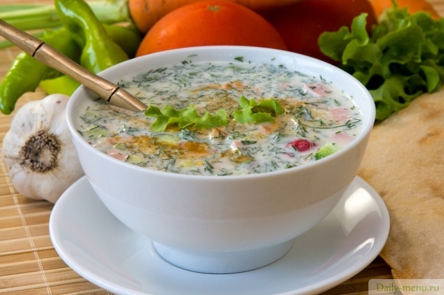 квас хлебный, белый гриб маринованный, картофель, огурец грунтовый, сметана 20,0% жирности, яйцо куриное, лук зеленый, редис, морковь, укроп и другие пряные травы, горчица столовая, сахар-песок, соль поваренная пищевая