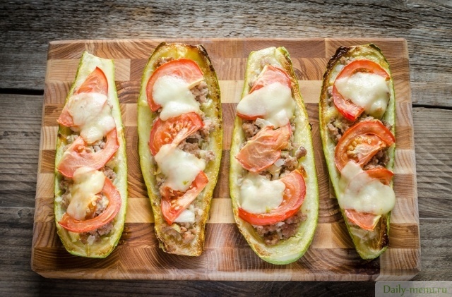 кабачок, фарш из говядины, лук репчатый, перец болгарский красный, помидоры, сыр российский, масло сливочное 82%, соль поваренная пищевая, перец черный молотый