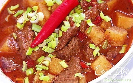вода, говядина шейная часть, картофель, перец красный сладкий, морковь, петрушка корень, паприка сушёная, молотая, перец красный жгучий , чеснок