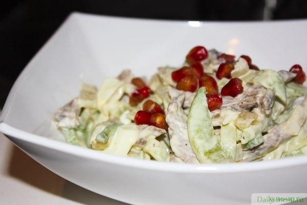 зеленая редька, лук репчатый, говядина отварная, яйцо куриное, соус майонезный "слобода", 35% жирности, масло подсолнечное, гранат