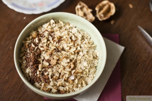 крупа овсяная, молоко 2,5% , мед натуральный (мёд), изюм, орех грецкий, семя льна