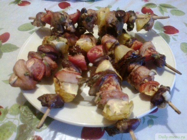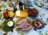 куриное филе, сердце куриное, печень куриная, помидоры, лук репчатый, соевый соус, масло подсолнечное, масло сливочное 72%, петрушка