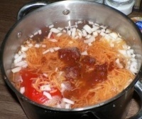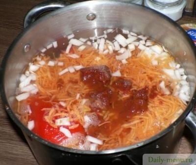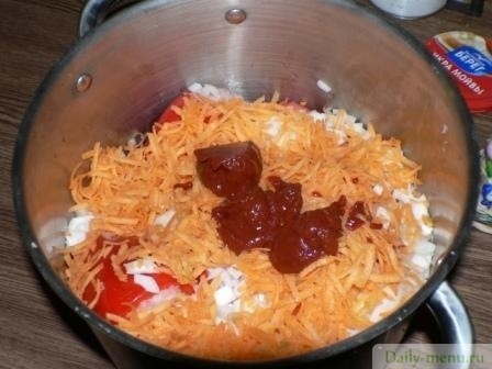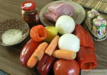 вода, перец болгарский красный, индейка, грудка без кожи, лук репчатый, помидоры, морковь, рис белый, томатная паста, соль поваренная пищевая, сахар-песок