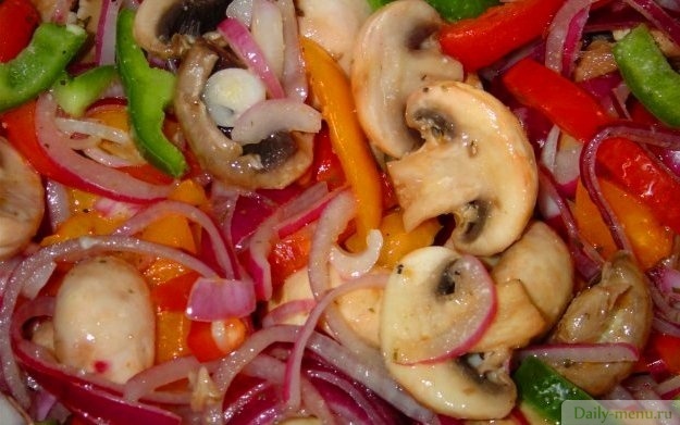 грибы ассорти чудеса леса, огурец маринованный, картофель, помидоры, перец болгарский красный, масло подсолнечное, лук репчатый, петрушка, укроп обыкновенный, перец красный молотый