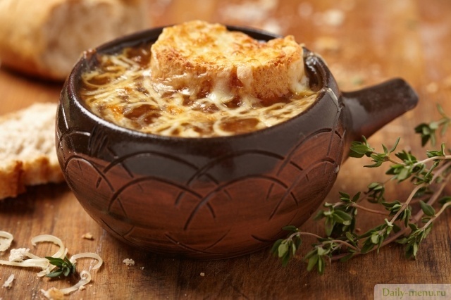 лук репчатый, вино сухое, куриный бульон, багет, сыр голландский, мука пшеничная , масло сливочное 72%, соль поваренная пищевая, перец черный молотый, лавровый лист