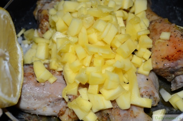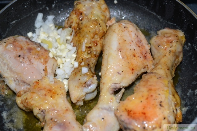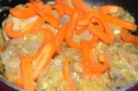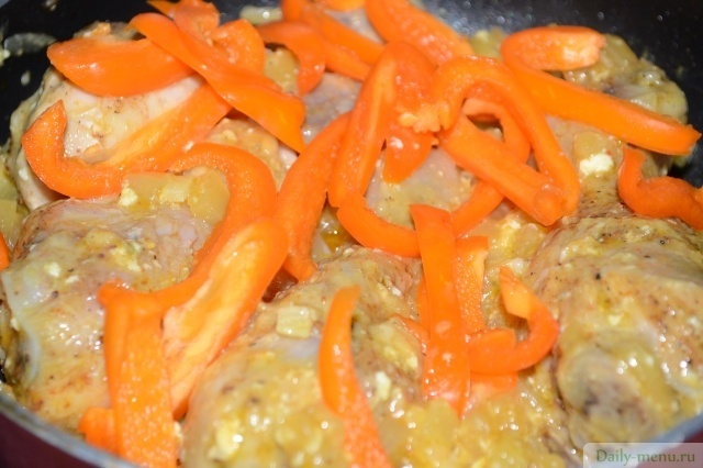 куриный окорочок, манго, сливки, 20,0% жирности, перец сладкий, лук репчатый, чеснок, паприка сушёная, молотая, базилик сушеный, зира (кумин), куркума