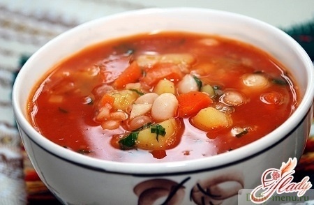 вода, белая фасоль консервированная, картофель, сок томатный, лук репчатый, морковь, масло подсолнечное, укроп сухой