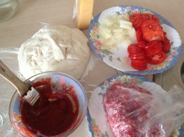 тесто дрожжевое (покупное), фарш из говядины, сыр пошехонский, помидоры, томатная паста, лук репчатый, масло подсолнечное
