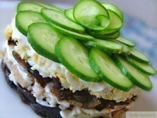 куриная грудка, без кожи, шампиньоны, майонез , яйцо куриное, огурец грунтовый, лук репчатый, чернослив