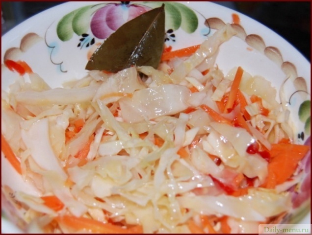 капуста белокочанная, морковь, масло подсолнечное, уксус 9%, сахар-песок, соль поваренная пищевая, чеснок, перец черный горошек, лавровый лист