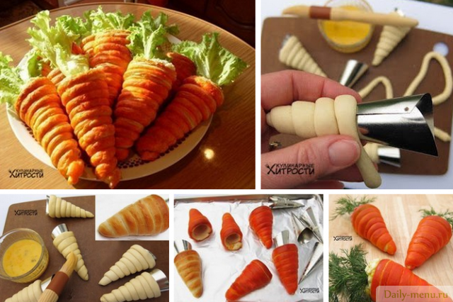 3. Положите трубочки из теста на противень, смажьте морковным соком с томатной пастой (можно взять оранжевый пищевой краситель) и запекайте до готовности в духовке.