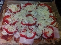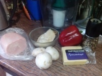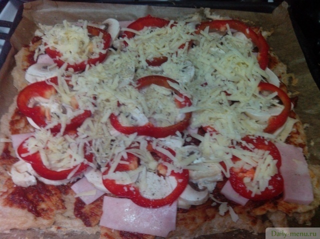 творог, 5 % , мука цельнозерновая, ветчина из индейки"коровино", перец красный сладкий, яйцо куриное, куриная грудка, без кожи, шампиньоны, сыробогатов, томатная паста, чеснок, соль поваренная пищевая, перец черный молотый, пищевая сода, базилик сушеный
