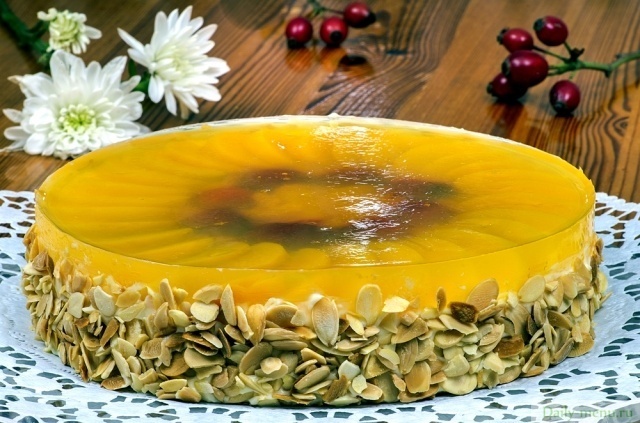 апельсин, сок апельсиновый, персики консервированные, миндаль жареный, вишня, мед натуральный (мёд), желатин пищевой