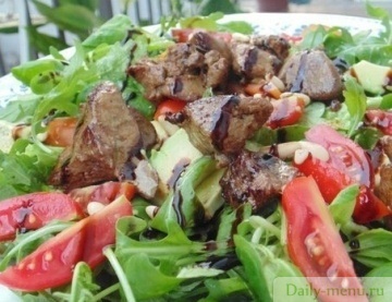 печень куриная, салат, помидоры, авокадо, масло оливковое, сок лимонный, бальзамический уксус