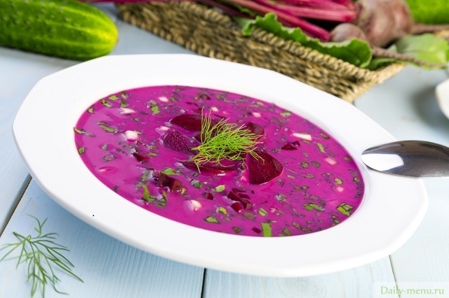 кефир 1% жирности, свекла, огурец грунтовый, картофель, яйцо куриное, лук зеленый, укроп и другие пряные травы, соль поваренная пищевая