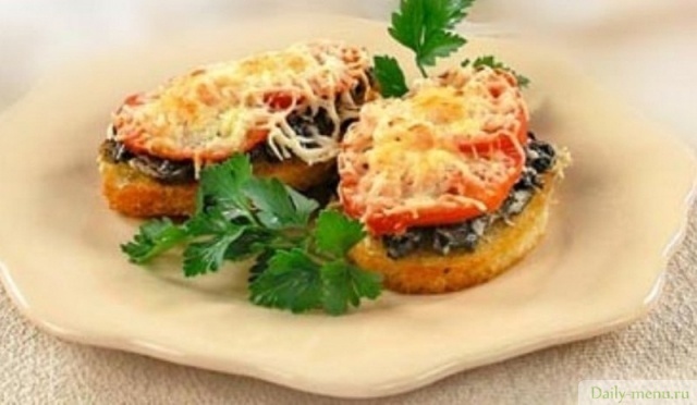 хлеб ржано-пшеничный, шампиньоны, помидоры, сыр голландский, масло сливочное 82%, лук репчатый, масло оливковое