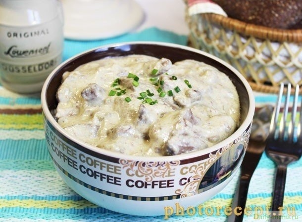 печень свиная, сметана 15,0% жирности, лук репчатый