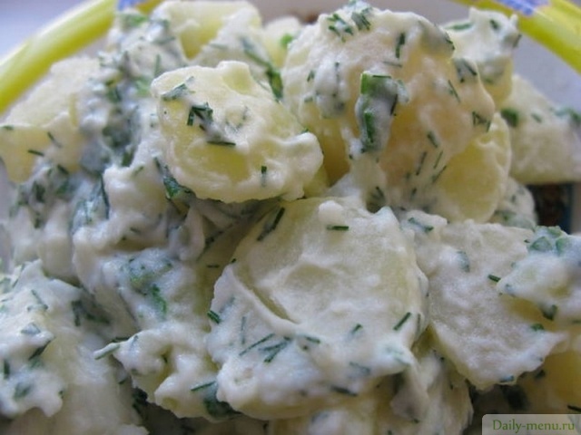 картофель, сметана 18% жирности, огурец грунтовый, вино сухое, укроп и другие пряные травы, чеснок, соль поваренная пищевая