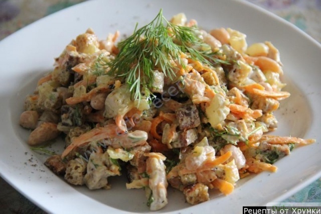 фасоль стручковая. консервы, морковь по-корейски, сыр "витязь" 50%, морковь, лук репчатый, кириешки бородинские с чесноком, майонез , масло подсолнечное