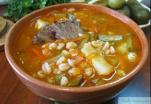 вода, баранина с косточкой, картофель, огурцы соленые, лук репчатый, морковь, крупа перловая, петрушка, соль поваренная пищевая, сметана 20,0% жирности, масло оливковое, перец черный молотый, лавровый лист