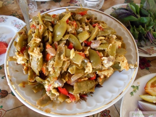 фасоль стручковая, помидоры, лук репчатый, яйцо куриное, вода, масло подсолнечное, кинза, базилик свежий, чеснок, соль поваренная пищевая, перец красный жгучий