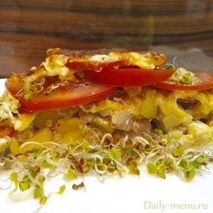 картофель, свинина котлетное мясо, сыр твердый (маасдам), помидоры, сметана 15,0% жирности, чеснок