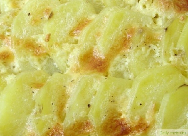 Очистить картофель и порезать его на дольки.Вскипятить молоко ,добавить чеснок, перец, соль и вылить в форму, туда же сложить картофель. Сверху положить кусочки сливочного масла и сыр .Выпекать примерно 25 мин