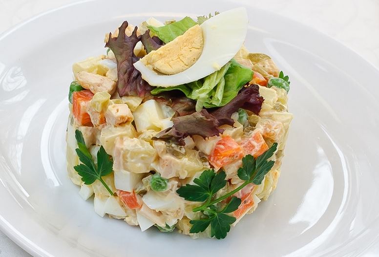 Переходим к салатам, причем не будем ограничиваться стандартным оливье, хотя и его также приготовим, но по специальному рецепту.