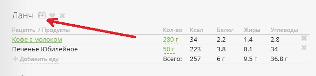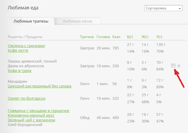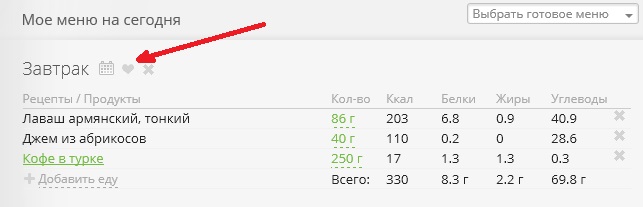 3 Если вы просто заранее приготовили много еды и знаете, что сегодняшний ужин будет у вас и на завтрак следующего дня или на обед, то можно не запоминать трапезу в «любимую», а просто назначить её на нужную дату любого дня. Для этого выберите соответствующую кнопку возле названия трапезы.