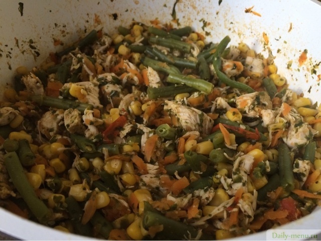 куриная грудка, без кожи, кукуруза консервы, фасоль стручковая, помидоры, морковь, шпинат, укроп и другие пряные травы