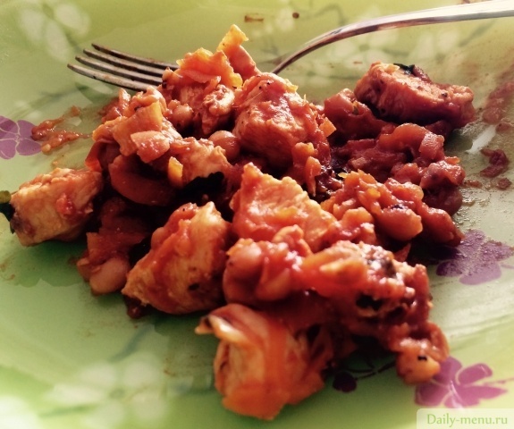 куриная грудка, без кожи, фасоль в томатном соусе, морковь, помидоры, чеснок, лук репчатый