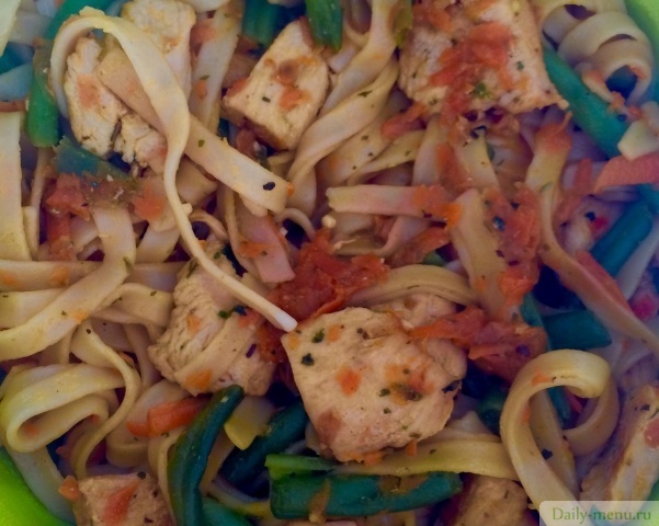 лапша длинная из твердых сортов пшеницы, куриная грудка, без кожи, фасоль стручковая, морковь, соевый соус, соль поваренная пищевая