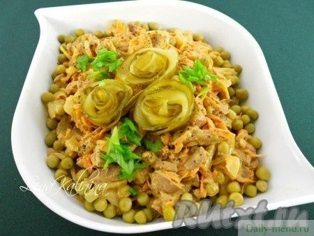 вода, филе куриное без кожи, огурцы соленые, морковь, майонез , горошек зеленый. консервы, лук репчатый, масло подсолнечное, укроп обыкновенный, соль поваренная пищевая, перец черный молотый