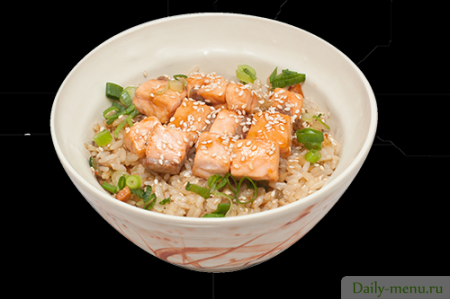 рис белый, огурец грунтовый, лук репчатый, морковь, лосось атлантический (семга), соус терияки, чеснок, масло оливковое, лук зеленый, кунжут-семя, соль поваренная пищевая