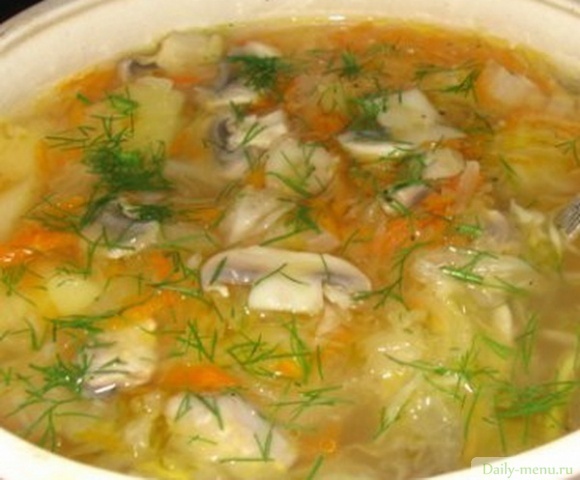 вода, капуста белокочанная, шампиньоны, лук репчатый, петрушка корень, морковь, укроп и другие пряные травы, масло подсолнечное, мука цельнозерновая
