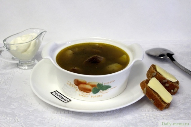 вода, шампиньоны, картофель, лук репчатый, крупа перловая, морковь, лук-порей, масло подсолнечное, перец черный горошек, лавровый лист