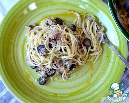 тунец натуральный консервы, паста (спагетти), лук репчатый, сыр полутвердый (голландский), масло оливковое